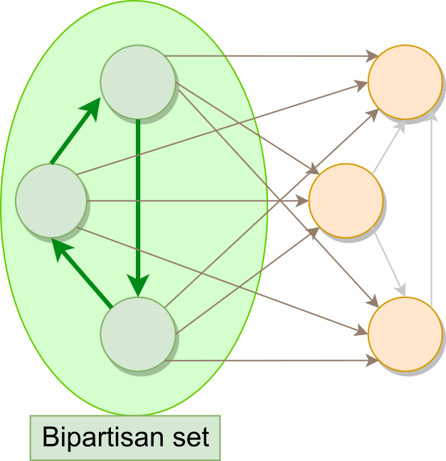 For every configuration of the graph, there exists an optimal, unbeatable strategy, just as there is in games like Rock-Paper-Scissors. Taking Rock-Paper-Scissors as an instance, playing each of Rock, Paper, and Scissor 1/3 of the time constitutes an unbeatable strategy. This means no other strategy can expect to outperform it in the long run. However, if we tweak the rules so that paper loses to rock, then the optimal strategy shifts to always choosing Rock. In this altered game, Rock becomes the only element in the Bipartisan set.