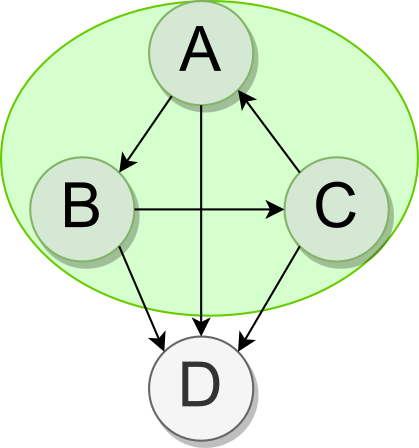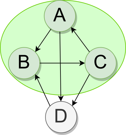 An even more complicated case, there is still a cycle between A, B, C but this tie D manages to beat a leading candidate (A). However, it can be viewed as a sub-clone of C. Every duel that D wins is also won by C, and C surpasses D. Translating this to a Rock-Paper-Scissors-like game, it's consistently more beneficial to choose C over D. The unbeatable strategy remains P(A) = P(B) = P(C) = 1/3 , and P(D) = 0, leading to the Bipartisan set being {A, B, C}.