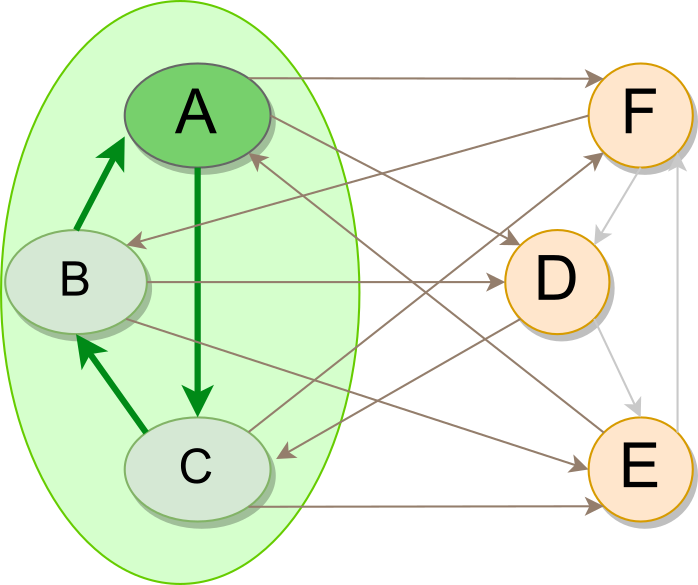 Firstly, envision the candidates as game elements, like rock, paper, or scissors. To determine the relationships between them, we create a "Graph of Duels". In this graph, each candidate is represented as a node. When one candidate is preferred over another in pairwise comparisons, a directed arrow is drawn from the winning candidate's node to the losing candidate's node. An example of this graph is displayed below: